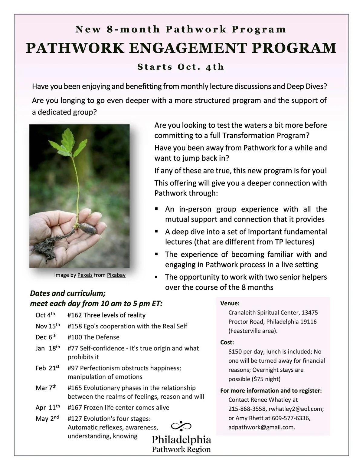 Ready to go deeper into a Living the Path lecture on this year’s theme? Join other Pathwork students in our region and beyond for a morning of discovery and process. You’ll come away with a deeper understanding of the ideas and feelings that are all contained in the lectures— and that we can discover together in community.