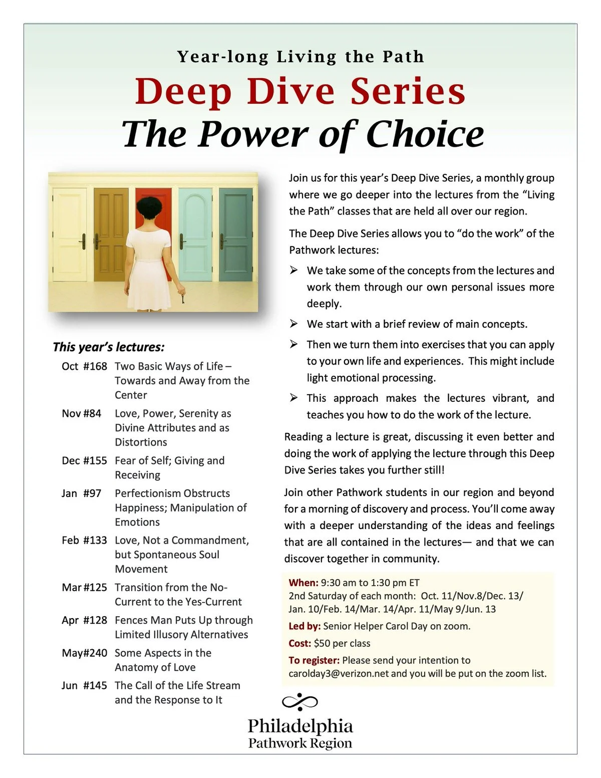 Join us for our free monthly Pathwork lecture discussion groups. This year’s theme is The Power of Choice. Held by Pathwork leaders online on different days and times, you are welcome to join one or more each month for lively discussions, meditations, exercises and more.