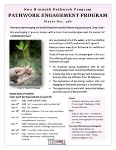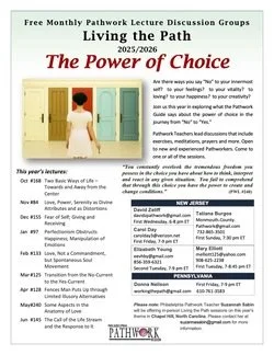 Join us for our free monthly online Pathwork lecture discussion groups. Led by Pathwork leaders on different dates and times, you are welcome to join one or more. Enjoy lively discussions, meditations, exercises and more! See the flyer for details.