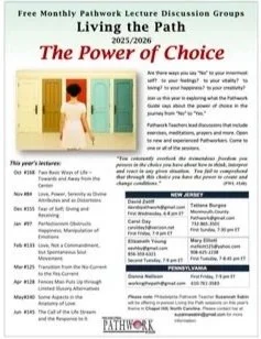 Join us for our free monthly Pathwork lecture discussion groups. This year’s theme is The Power of Choice. Held by Pathwork leaders online on different days and times, you are welcome to join one or more each month for lively discussions, meditations, exercises and more.